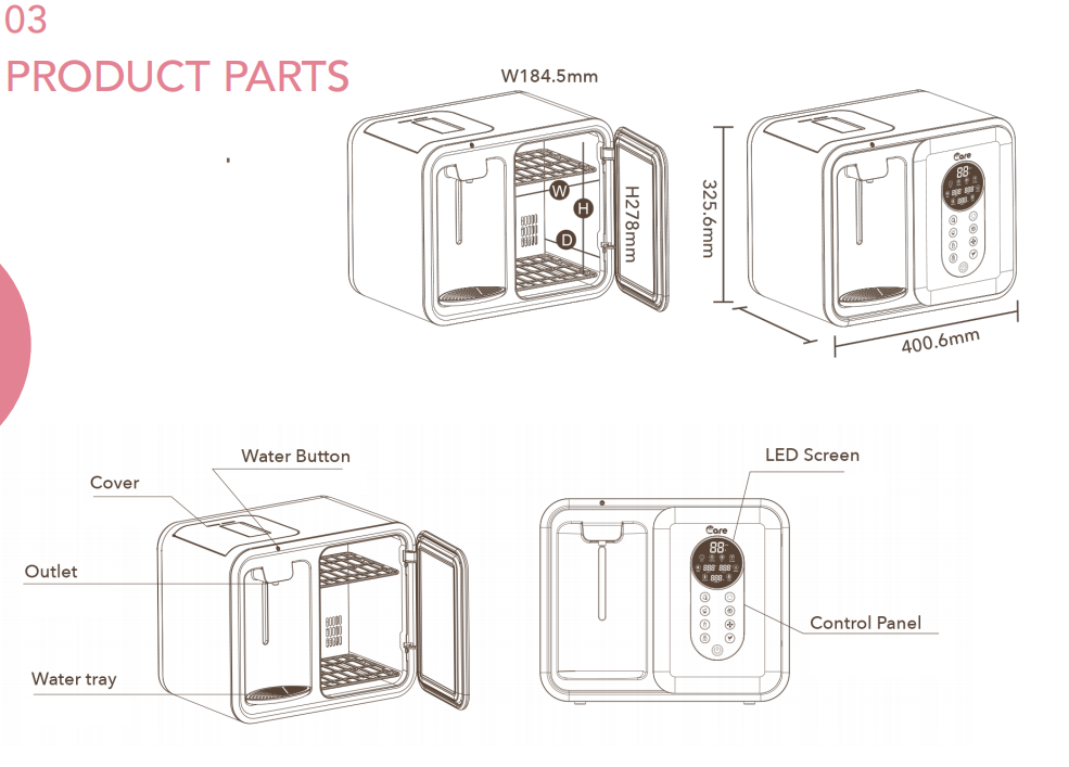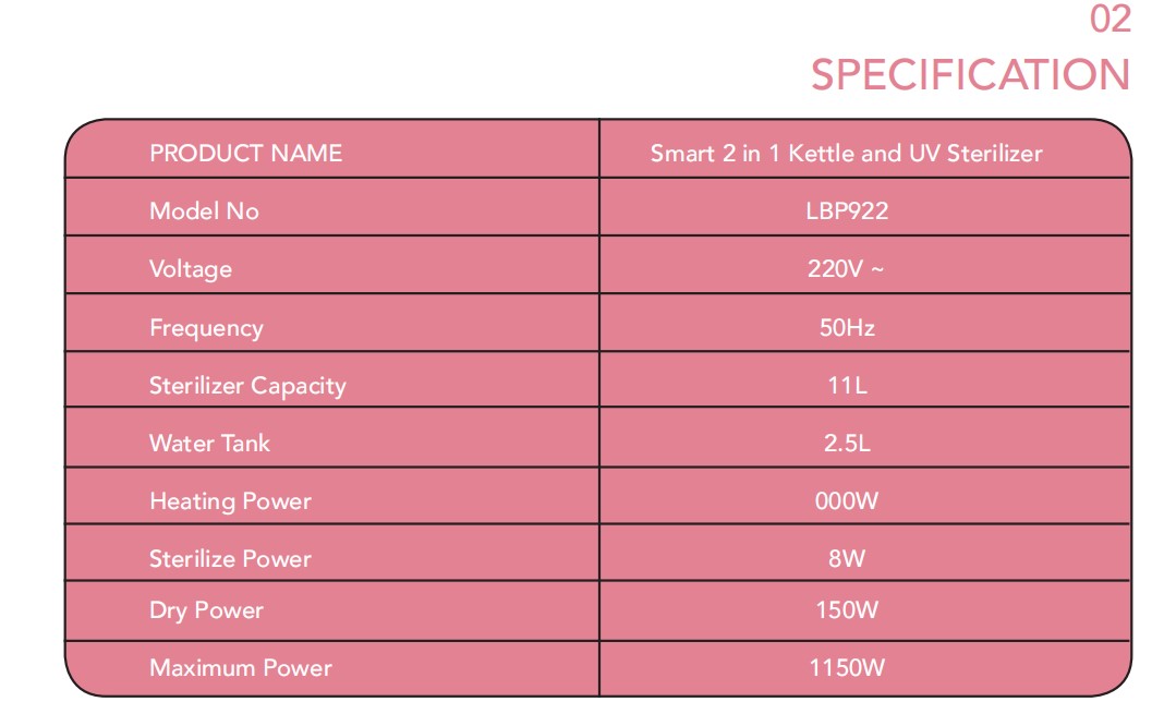 Sterilize: Sterilize for 5 / 10 / 15 mins, the time can be adjusted by touching the function button.